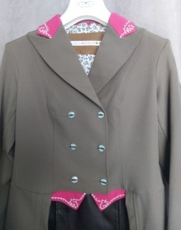 Animo ženski dresurni suknjič Lagos v rjav barvi z roza ovratnikom in kristalčki.