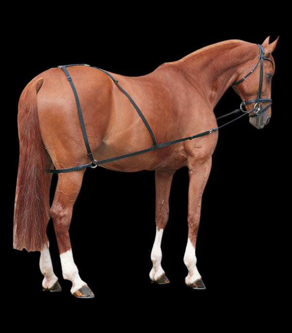 - Zaokrožene stranske vajeti, ki aktivirajo konjev zadnji del in preprečujejo, da bi konj spremenil delovni okvir.
