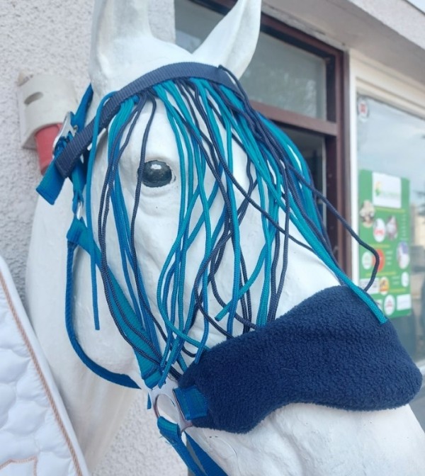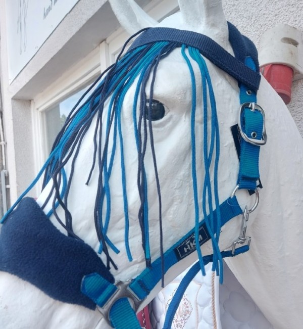 HKM hlevska oglavka z resicami modre barve in velikosti full.
