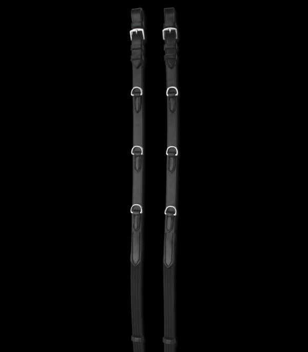 - Posebej trpežne vajeti iz tkanine z usnjenimi omejevalniki in tremi našitimi D-obročki se ujemajo z martingalom Thiedemann.
